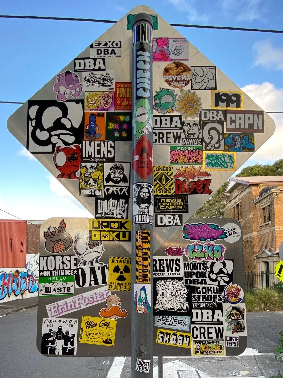 “I’ve been making stickers and slapping them up since 2019 but have been drawing and doodling ever since I can remember. My character, which I guess you could call ‘Jepsi’, is an unconscious mash up of my favourite cartoon characters, as well as my own drawings as a kid. Pretty much every sticker or graffiti artist that has influenced me in some way has a sticker up on one of the road signs hung in the show. This character is a slowly arrived at motif which has allowed me enormous freedom to explore different themes, colours and fills.