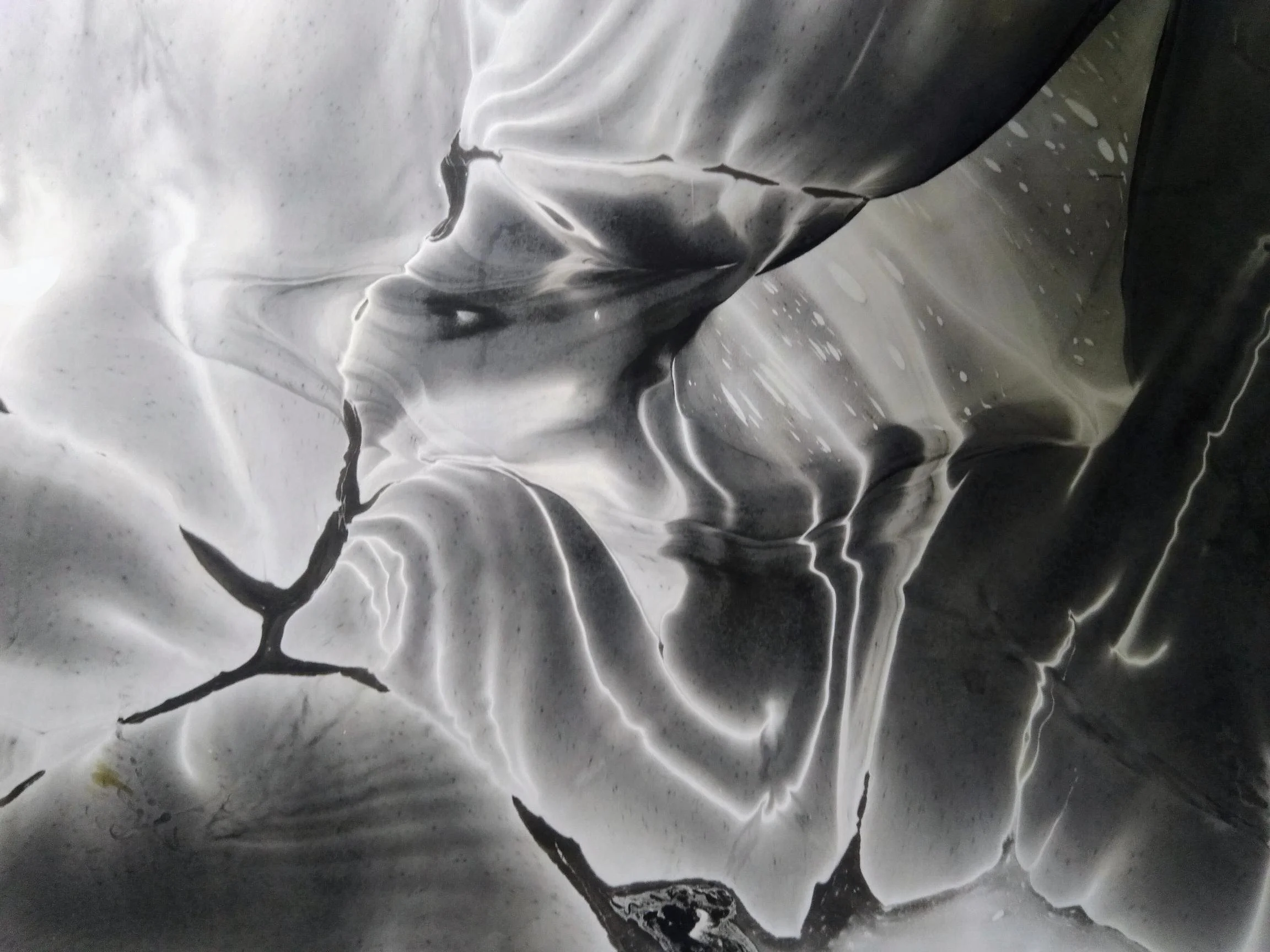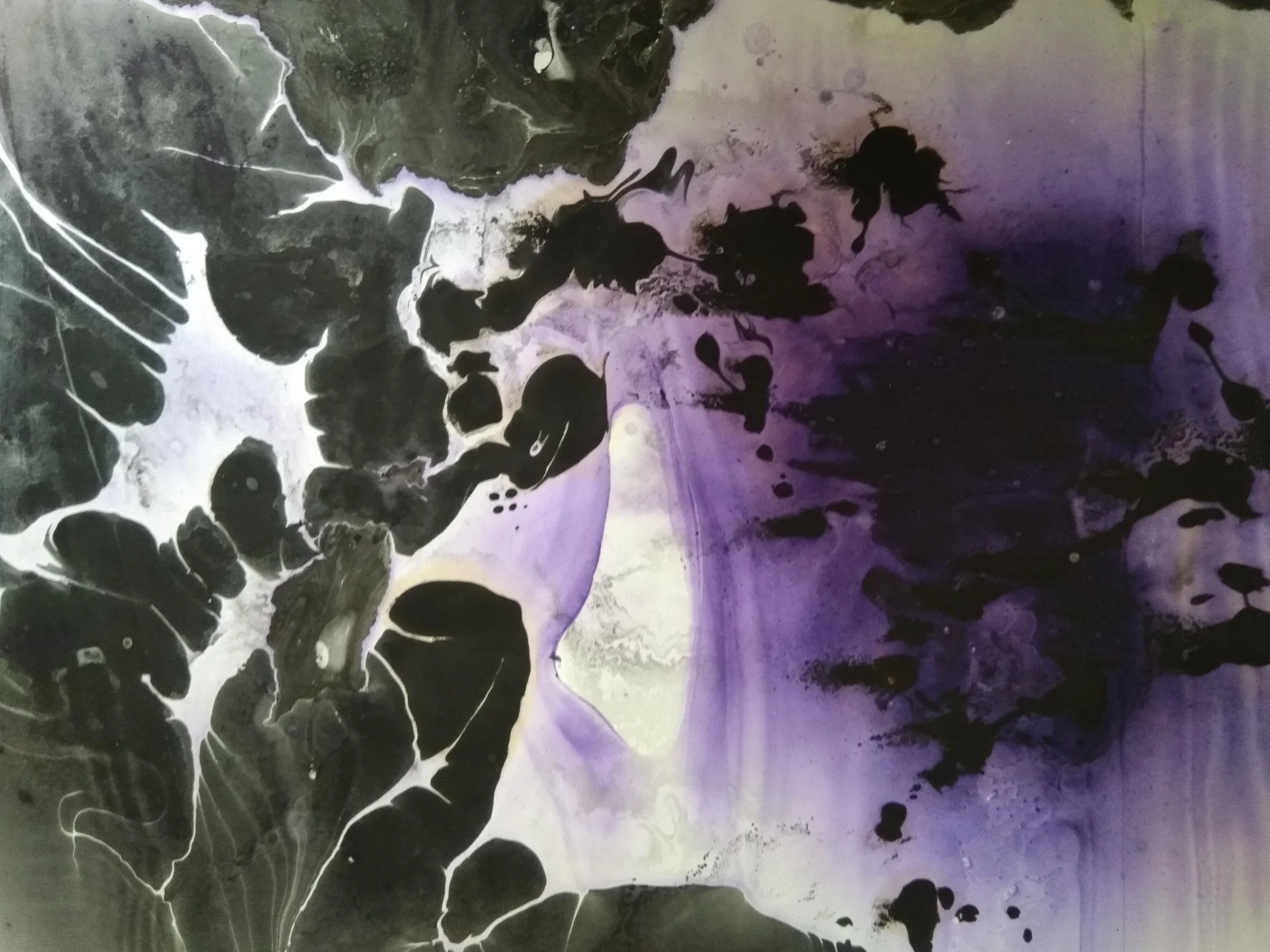 I noticed that various media, when combined with various liquids, behaved in a like manner, often with exciting, spontaneous results. This played well into my long-held fascination with the philosophies of Zen Buddhism and Hinduism, which had led me to my travels in Asia as an arts graduate, eager to explore the world in my twenties. I discovered the vibrancy in mandala paintings and spontaneous swirl of the brushstrokes performed by Japanese masters of calligraphy.