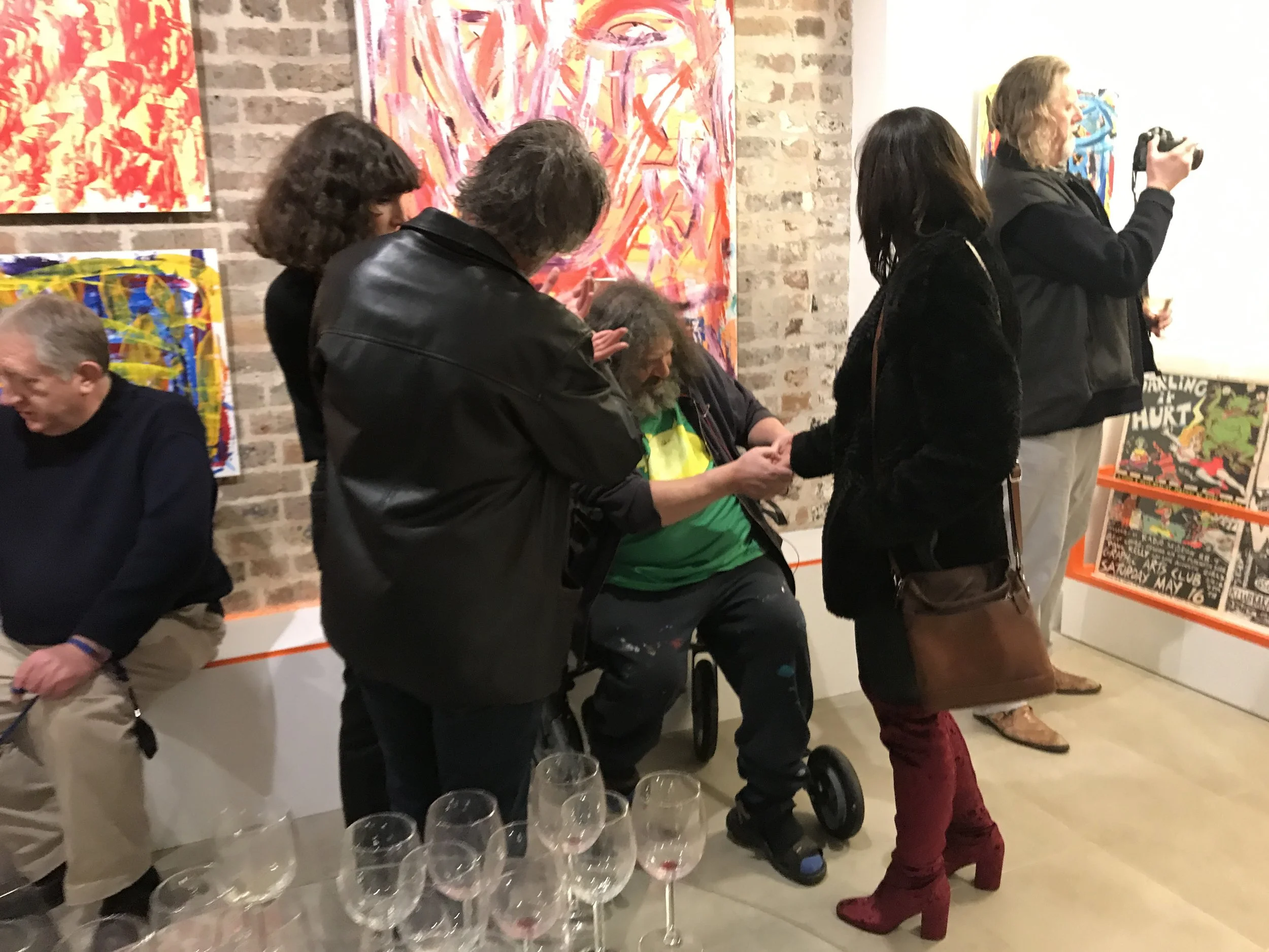 Michael Saker palm reading on opening night of 'The Work of Michael Saker' at Disorder Gallery